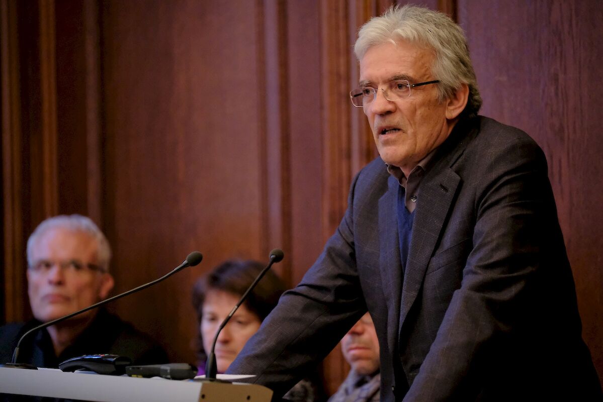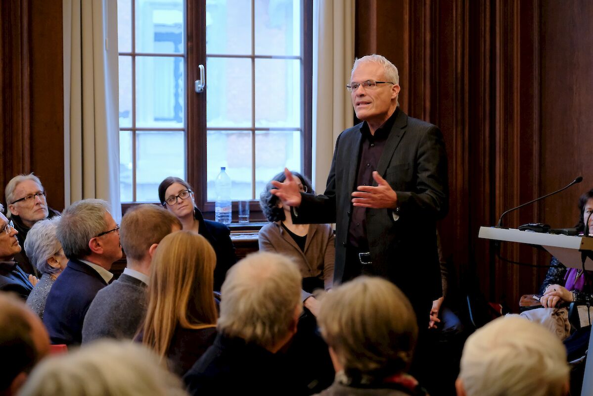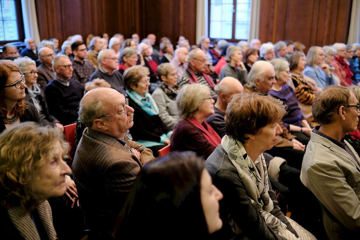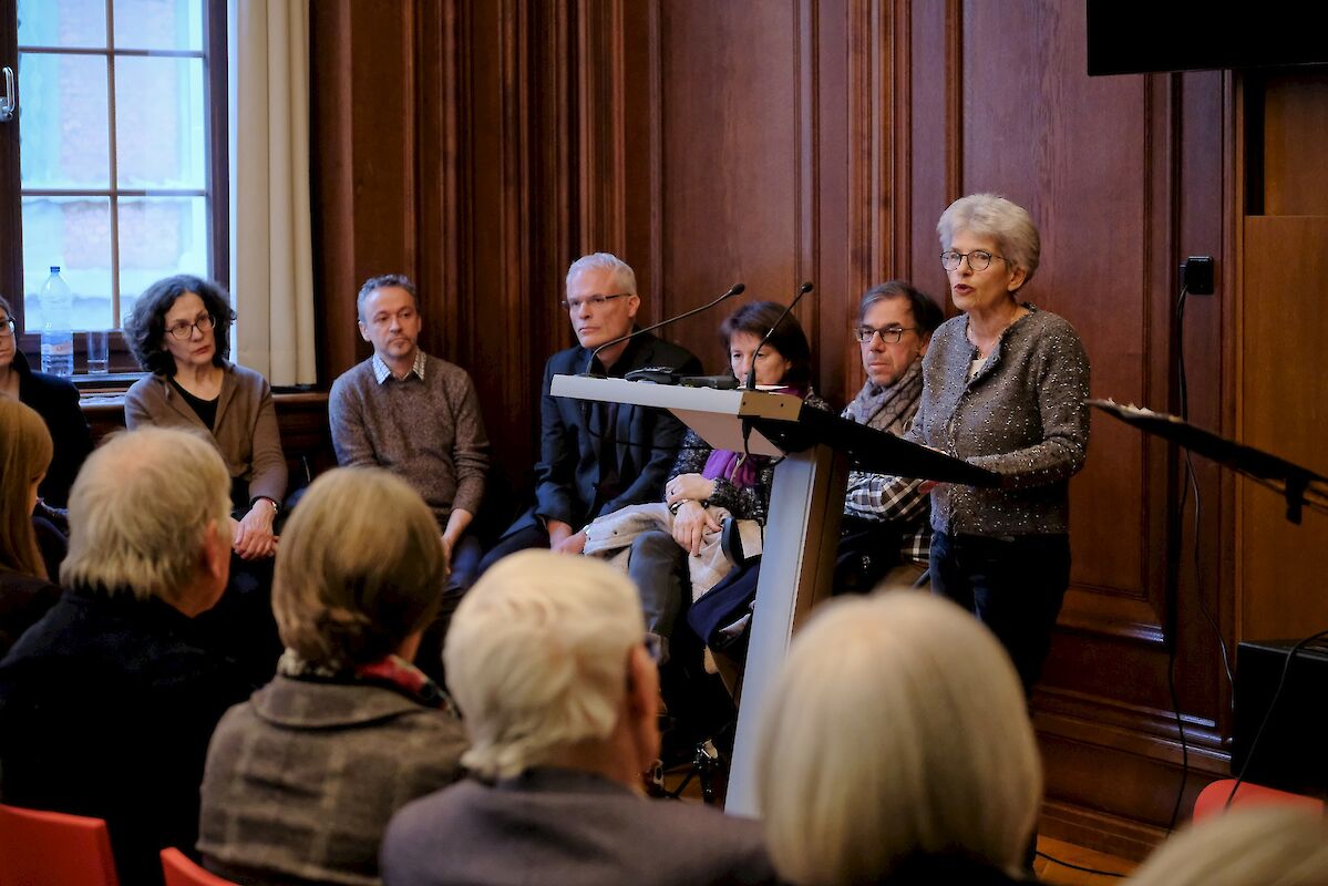 Prof. em. Dr. Jacques Picard hielt die sehr persönliche Laudatio. Besonders betonte er dabei, dass jüdische Flüchtlinge, die sich in der Schweiz niederliessen, keine Opfer, sondern Überlebende waren. Gerade diese ungeheure Kraft, die das Überleben freisetzte, war der Motor eines Kurt Bergheimer Biglers. In der Schweiz gelang ihm ein beeindruckender gesellschaftlicher Aufstieg. Lea Blochs Buch sei kein lautes Buch, aber ein wichtiges, denn es sensibilisiere uns auch dafür, dass heute weltweit Tausende junge Flüchtlinge unterwegs seien.