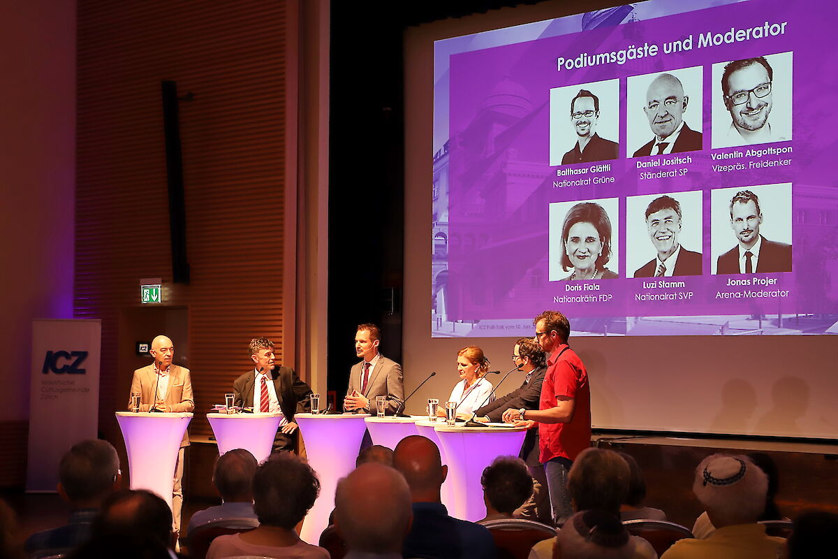 In der Mitte des Festsaals der ICZ stellten sich die Nationalräte Balthasar Glättli der Grünen, Luzi Stamm der SVP und Doris Fiala der FDP, Ständerat Daniel Jositsch der SP und Valentin Abgottspon, Vizepräsident der Freidenker, einem Dialog – offen und ehrlich und das um kontroverse Themen. Ganz im Sinne einer Folgeveranstaltung des Dialogpreises Schweizer Juden, der Ende Mai in Bern verliehen wurde, wurde der Aufforderung nach mehr Dialog Rechnung getragen. Herbert Winter, Präsident des Schweizerischen Israelitischen Gemeindebunds SIG, hatte sich mit dem Aufruf «Wir müssen reden» für einen gesamtgesellschaftlichen Dialog stark gemacht.