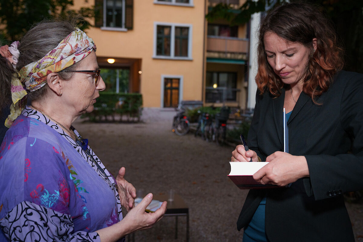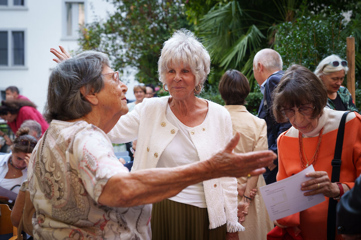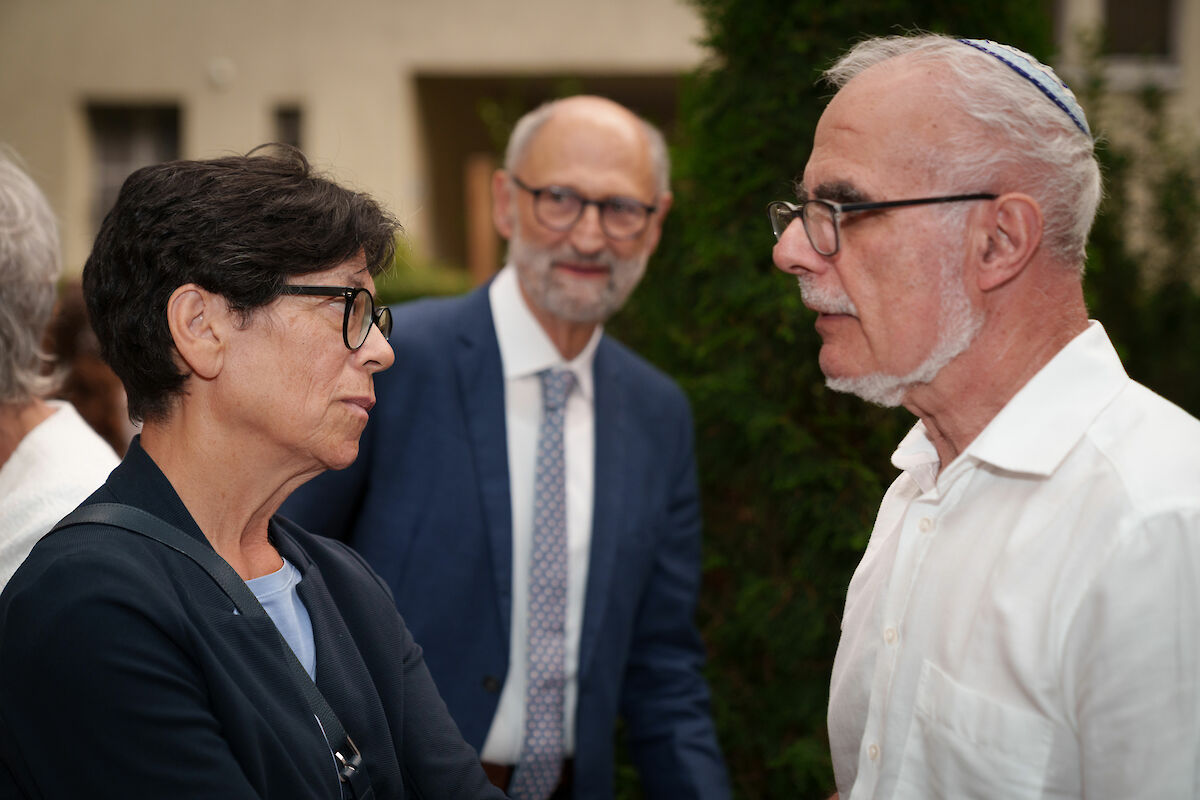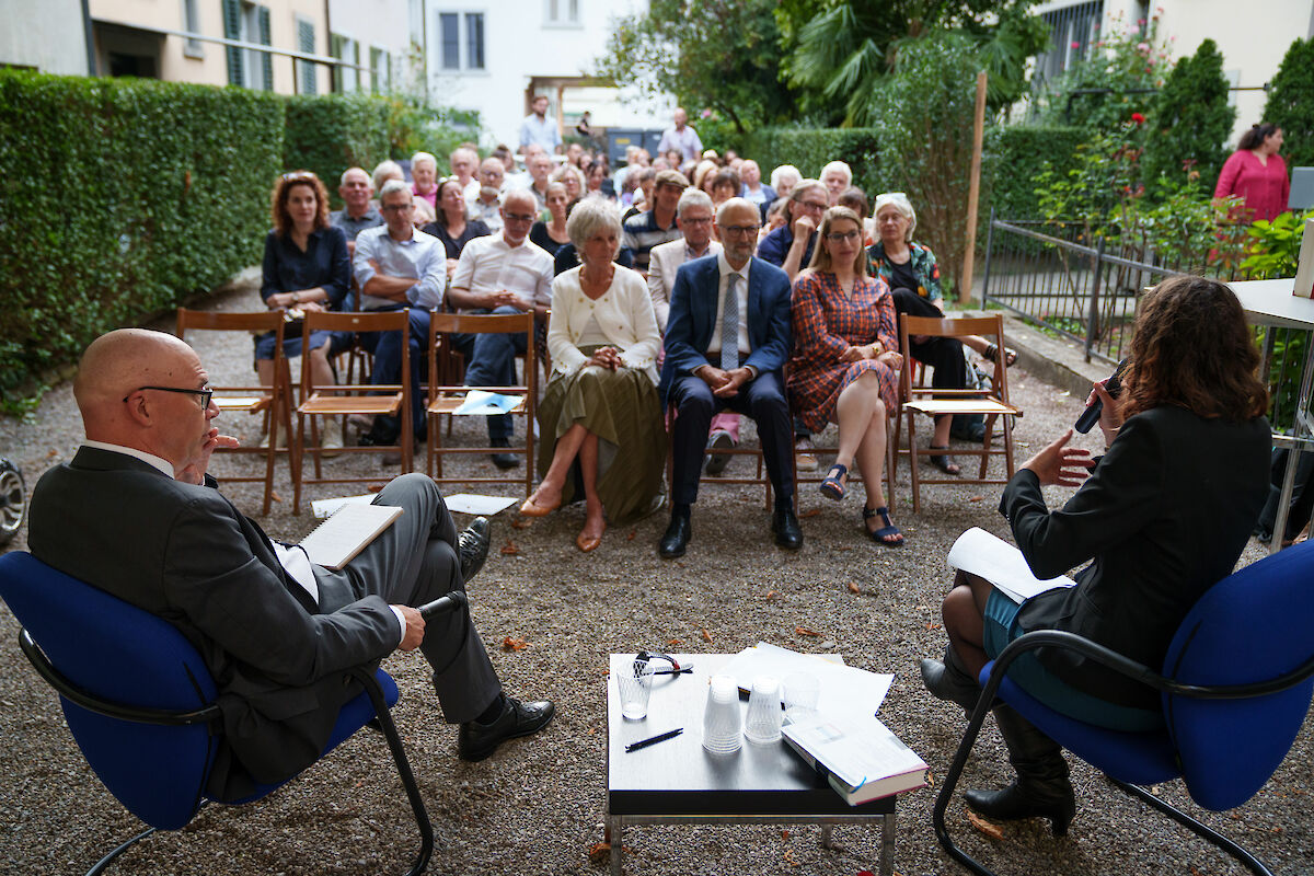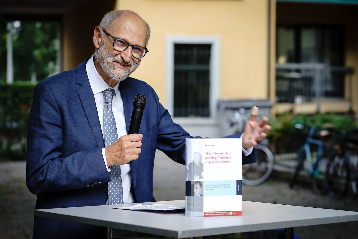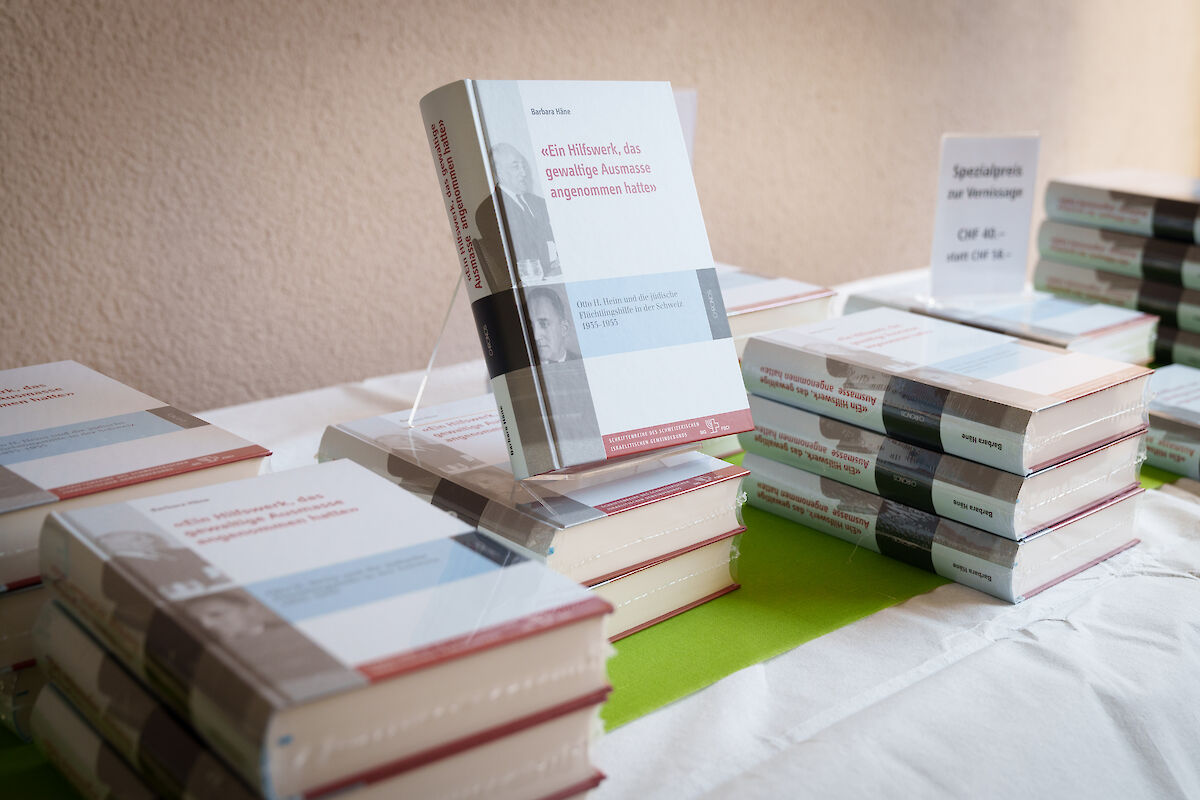 Die Vernissage fand am 12. September 2023 im Hof des Guggenheim-Hauses, dem Sitz des VSJF, statt. SIG-Präsident Ralph Lewin begrüsste die rund sechzig anwesenden Gäste mit den Worten: «Es ist immer wieder eine grosse Freude, wenn sich Wissenschaftlerinnen und Wissenschaftler für die SIG-Schriftenreihe als Publikationsort entscheiden. Mit ihrem Beitrag bereichern sie unsere Bücherreihe und werfen ein Licht auf weniger bekannte jüdische Persönlichkeiten oder noch unerforschte Aspekte der jüdischen Geschichte und Kultur in der Schweiz.» Sein spezieller Dank galt der Otto und Regine Heim Stiftung, die das Lebenswerk von Otto H. Heim weiterführt und die Publikation grosszügig unterstützt hat. Im anschliessenden Gespräch mit Prof. Erik Petry brachte Häne das Engagement Heims und des VSJF mit einem passenden Zitat auf den Punkt: «Die geleistete soziale Arbeit, die Hilfe im tragischen Geschehen unserer Zeit, ging und geht uns alle an, Juden und Nichtjuden. Wir alle müssen danken dafür, dass es uns vergönnt war, Elend zu lindern und Menschenleben zu retten.»