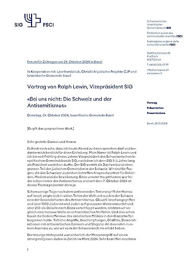 Im Rahmen des Forums für Zeitfragen wurde Ralph Lewin als Redner eingeladen. Sein Fokus, im Gemeindesaal der IGB in Basel, war der Antisemitismus in der Schweiz.