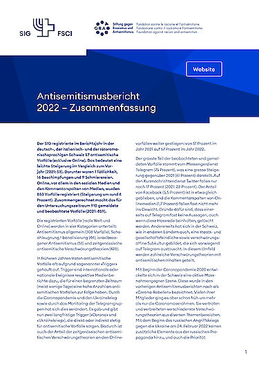 Ganzer BerichtIn der Schweiz hat sich seit Beginn der Coronapandemie vor drei Jahren eine verschwörungsaffine, gesellschafts- und staatsfeindliche Subkultur gebildet. In diesem Umfeld werden Online zahlreiche antisemitische Verschwörungstheorien verbreitet, vielfach zur Coronapandemie aber auch zu diversen anderen Themen. Sie ist damit hauptverantwortlich dafür, dass auch 2022 eine Steigerung bei den antisemitischen Vorfällen verzeichnet werden muss. In der realen Welt wurde ebenfalls ein leichter Anstieg festgestellt.