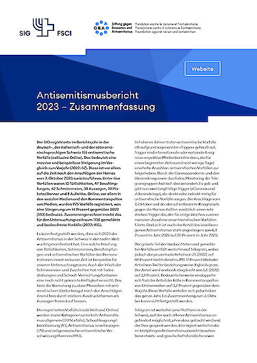 Ganzer BerichtDie Terroranschläge der Hamas auf Israel am 7. Oktober 2023 haben in der Schweiz regelrecht eine Antisemitismuswelle ausgelöst, die durch den folgenden Krieg in Gaza weiter angetrieben wurde. Die Erhebungen des Antisemitismusberichts zeigen hier die Manifestation eines Triggerereignisses, wie er in diesem Ausmass in den letzten Jahrzehnten nie beobachtet wurde.