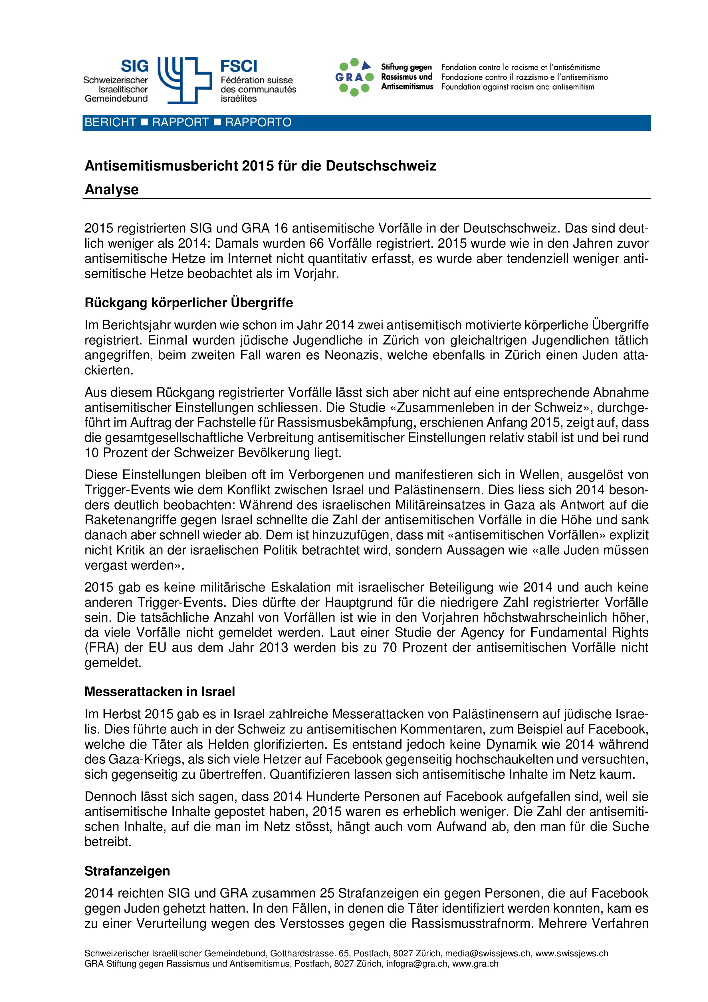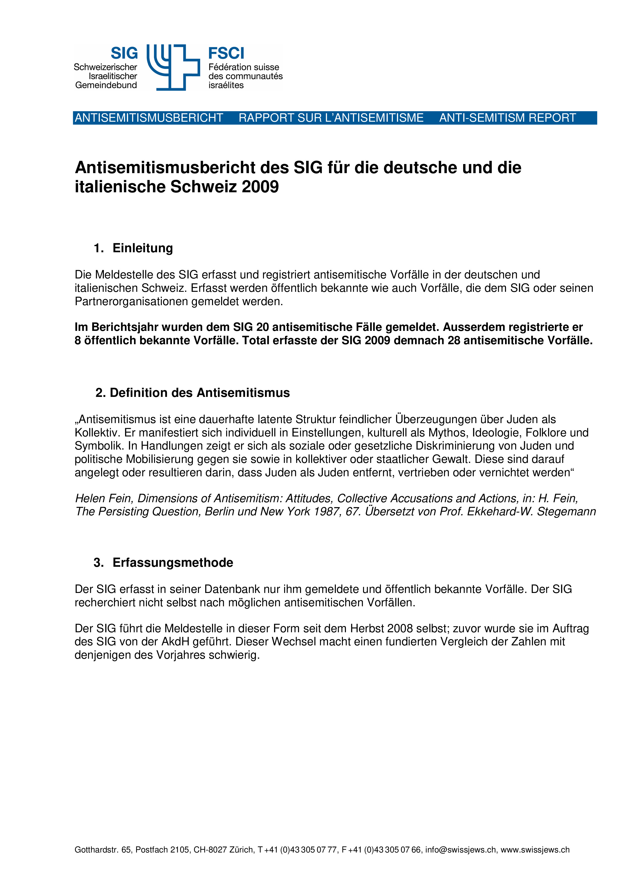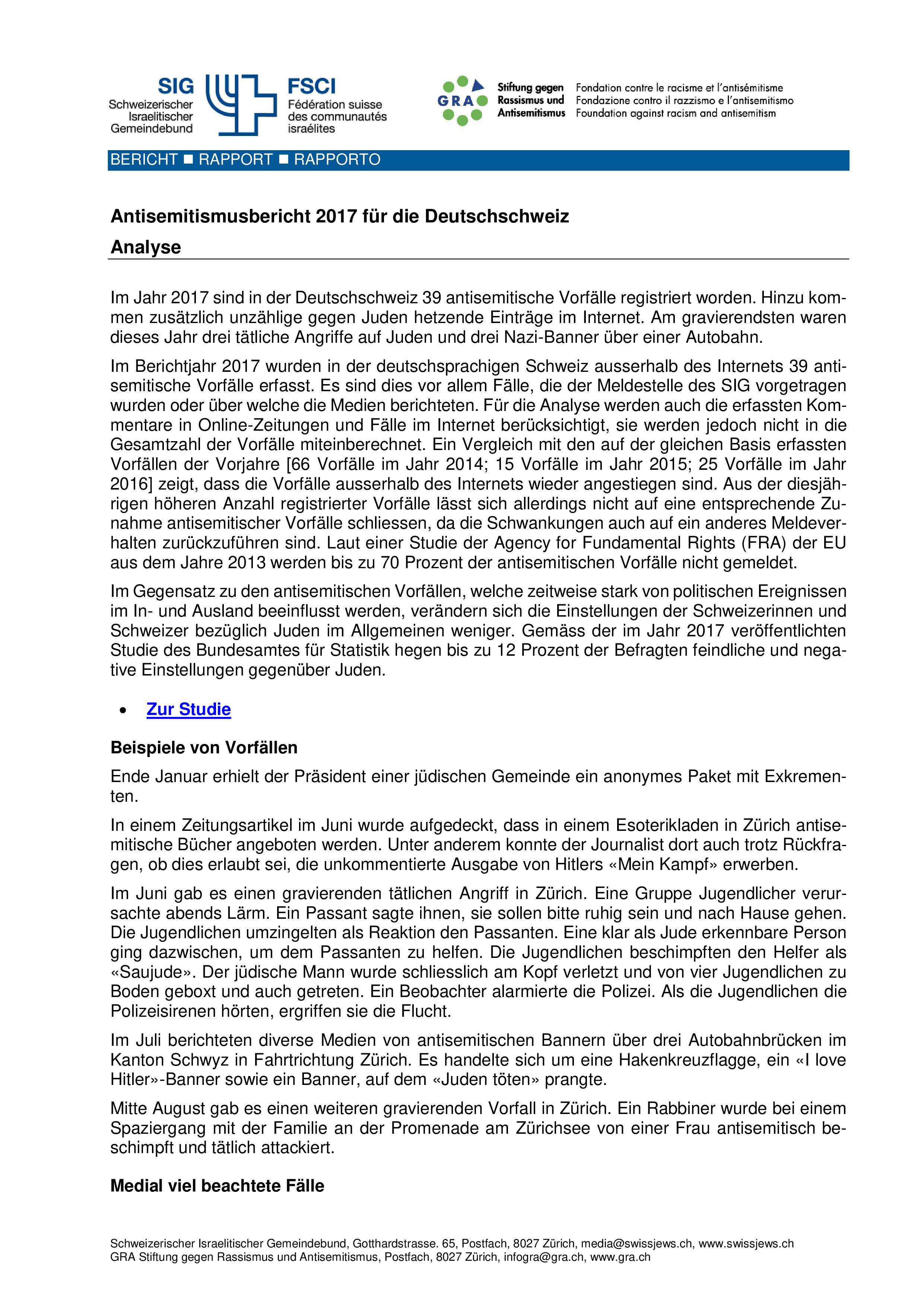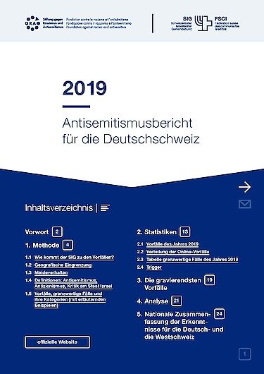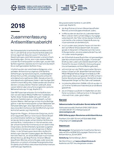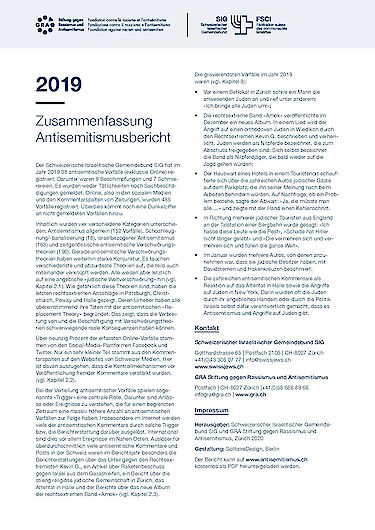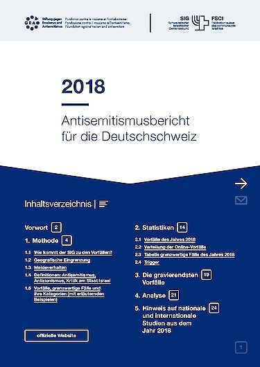 Seit 2008 veröffentlicht der SIG gemeinsam mit der Stiftung gegen Rassismus und Antisemitismus GRA jährlich einen Antisemitismusbericht für die Deutschschweiz. Mittlerweile erfasst er auch Vorfälle aus der italienisch- und rätoromanischsprachigen Schweiz. Um Methoden und Definitionen genauer zu erläutern, wurde der Bericht 2018 grundlegend überarbeitet. Er ist heute umfassender und enthält ausführlichere Statistiken.