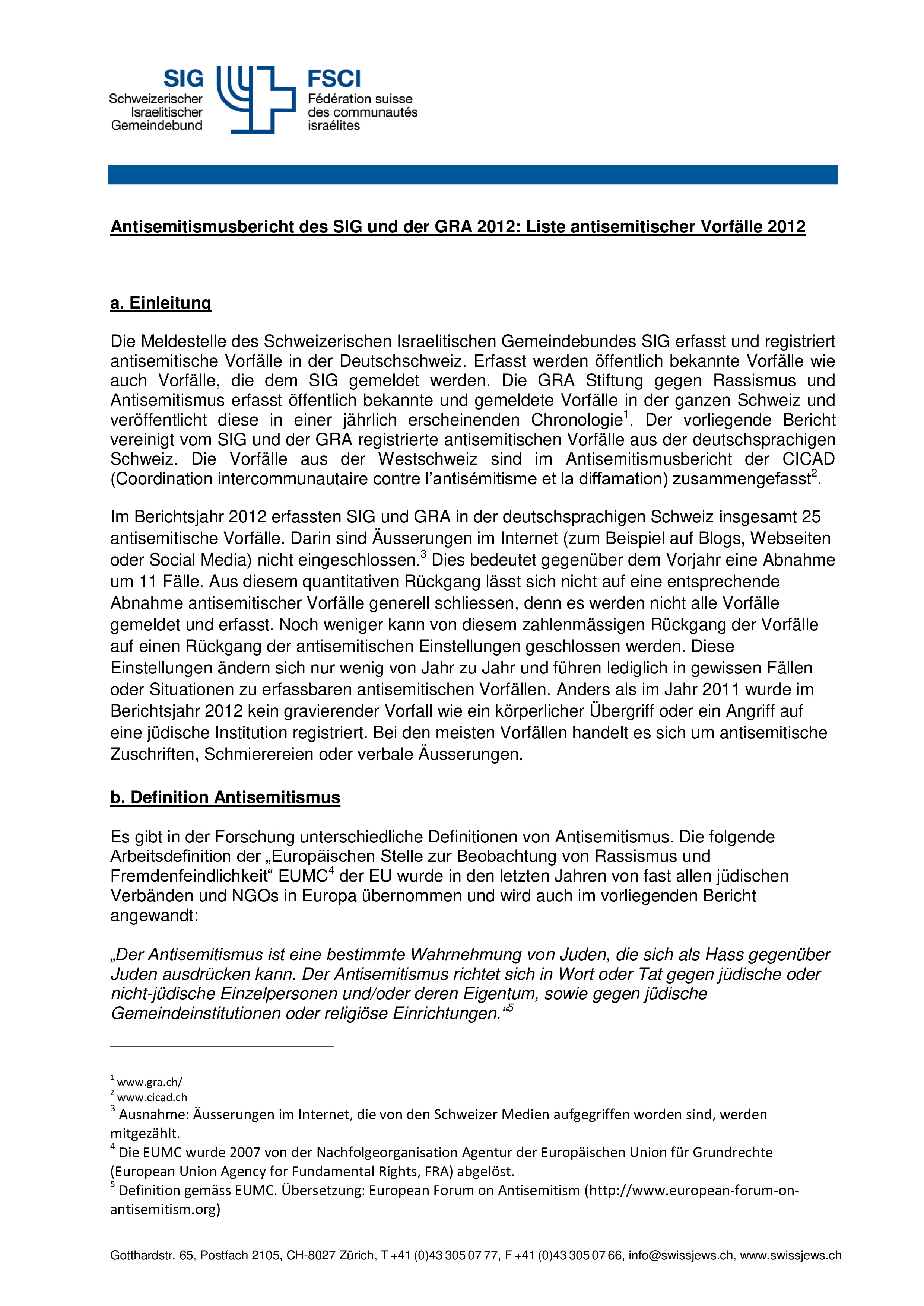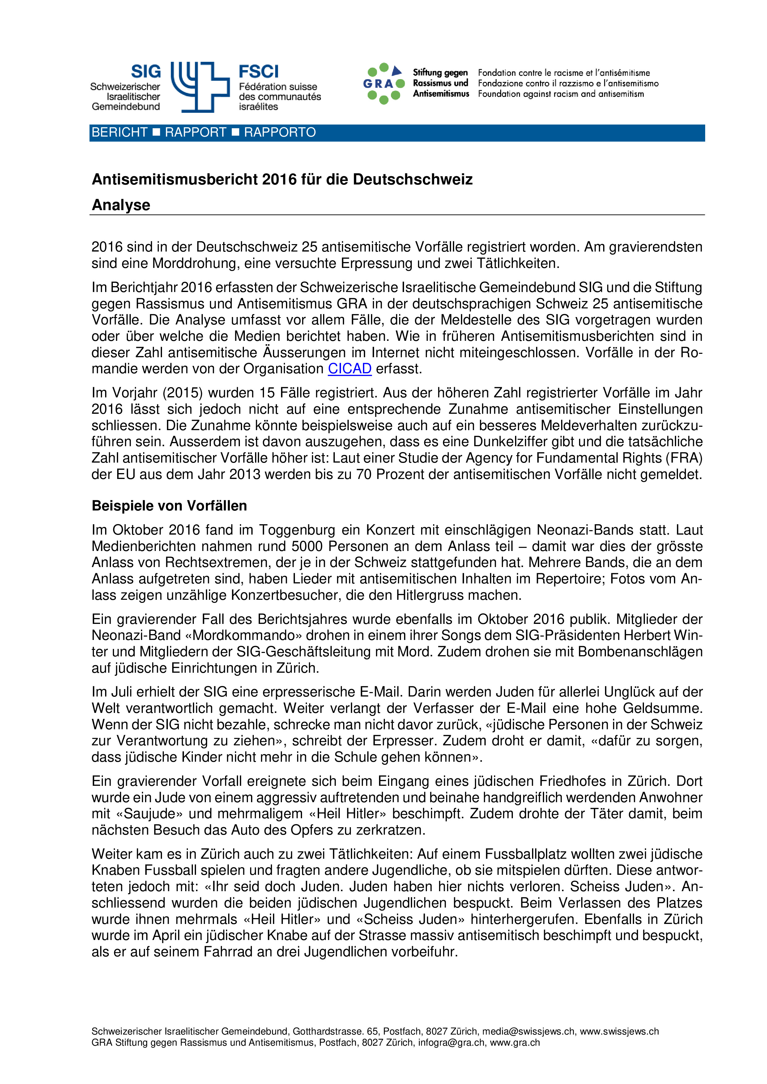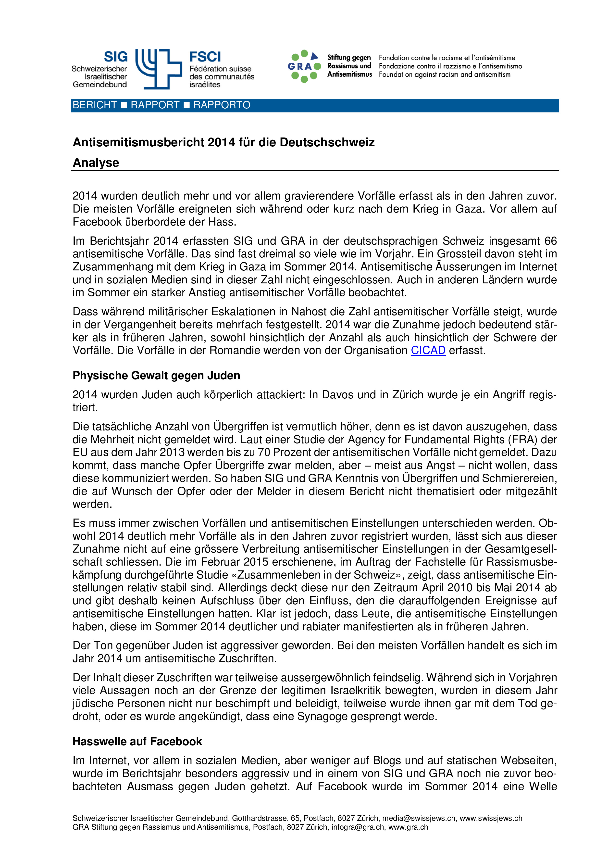 Seit 2008 veröffentlicht der SIG gemeinsam mit der Stiftung gegen Rassismus und Antisemitismus GRA jährlich einen Antisemitismusbericht für die Deutschschweiz. Mittlerweile erfasst er auch Vorfälle aus der italienisch- und rätoromanischsprachigen Schweiz. Um Methoden und Definitionen genauer zu erläutern, wurde der Bericht 2018 grundlegend überarbeitet. Er ist heute umfassender und enthält ausführlichere Statistiken.
