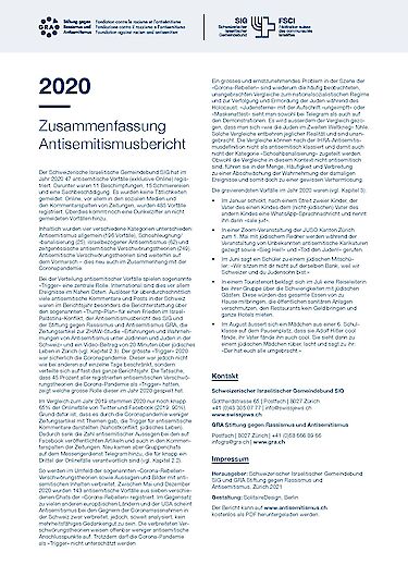 Ganzer BerichtDie Erhebungen zeigen weiterhin ein tiefes Niveau der Zahl physischer und verbaler antisemitischer Vorfälle. Im Onlinebereich fällt die weitere Zunahme antisemitischer Verschwörungstheorien auf, die in hohem Masse neu einen Bezug zur Coronapandemie aufweisen. Die Coronapandemie hat sich generell als Antisemitismus-Trigger erwiesen. Insbesondere im Umfeld der Corona-Rebellen und innerhalb von Telegram-Gruppenchats waren antisemitisch eingestellte Personen und deren antisemitische Beiträge aufgefallen. Als hochproblematisch wird ausserdem die zunehmende Instrumentalisierung der Schoah unter den Corona-Rebellen gewertet.