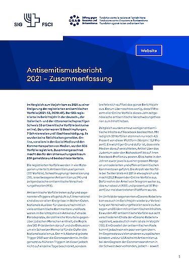 Ganzer BerichtDie hitzigen und unversöhnlichen Debatten rund um die Pandemie und deren Folgen führen zu einer verstärkten Verbreitung antisemitischer Haltungen. Das zeigt sich bei den beobachteten antisemitischen Vorfällen und insbesondere bei antisemitischen Verschwörungstheorien, die sich im Umfeld von Massnahmegegnern und -gegnerinnen weiter stark verbreitet haben. Das Niveau der Zahl physischer und verbaler Vorfälle bleibt auf tiefem Niveau aber mit einer Erhöhung. Im Onlinebereich wird eine starke Steigerung verzeichnet. Als Trigger fungierte auch 2021 im Wesentlichen die Coronapandemie.