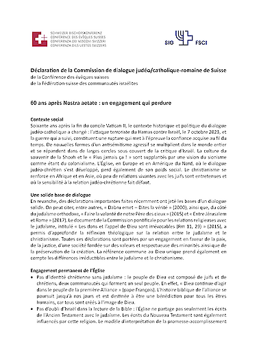 60 ans après Nostra aetate: un engagement qui perdureDéclaration de la Commission de dialogue judéo/catholique-romaine de Suisse