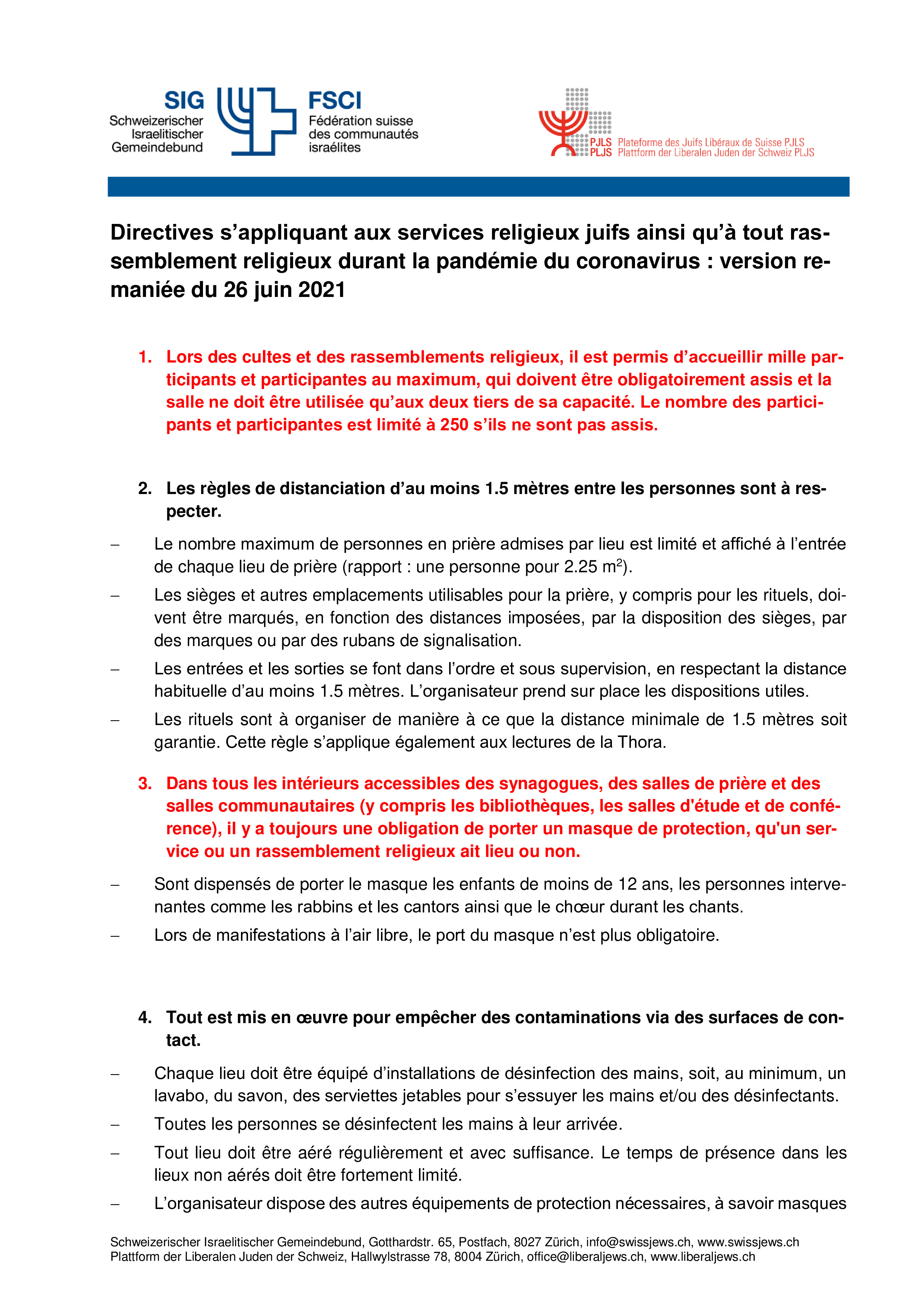 La Confédération a estimé pouvoir autoriser de tels rassemblements pourvu que soient imposées des consignes rigoureuses d’hygiène et de distanciation. Cet assouplissement est lié à la condition que les communautés religieuses développent leurs propres concepts de protection et garantissent le traçage des chaînes de transmission. Les organisations faîtières juives de la FSCI et de la PJLS avaient déjà élaboré fin avril, pour les services religieux juifs, un concept de protection sophistiqué qu’elles avaient soumis au Conseil fédéral ainsi qu’à l’Office fédéral de la santé publique OFSP. Dans la mesure où cela s’avérait nécessaire, ce concept avait ensuite été adapté au concept-cadre de l’OFSP. Toutes les communautés juives de Suisse s’efforcent de prévenir avec efficacité les contaminations pouvant être liées aux rassemblements religieux et de veiller à ce que soient appliquées en la matière des règles claires, en permettant un déroulement sûr.