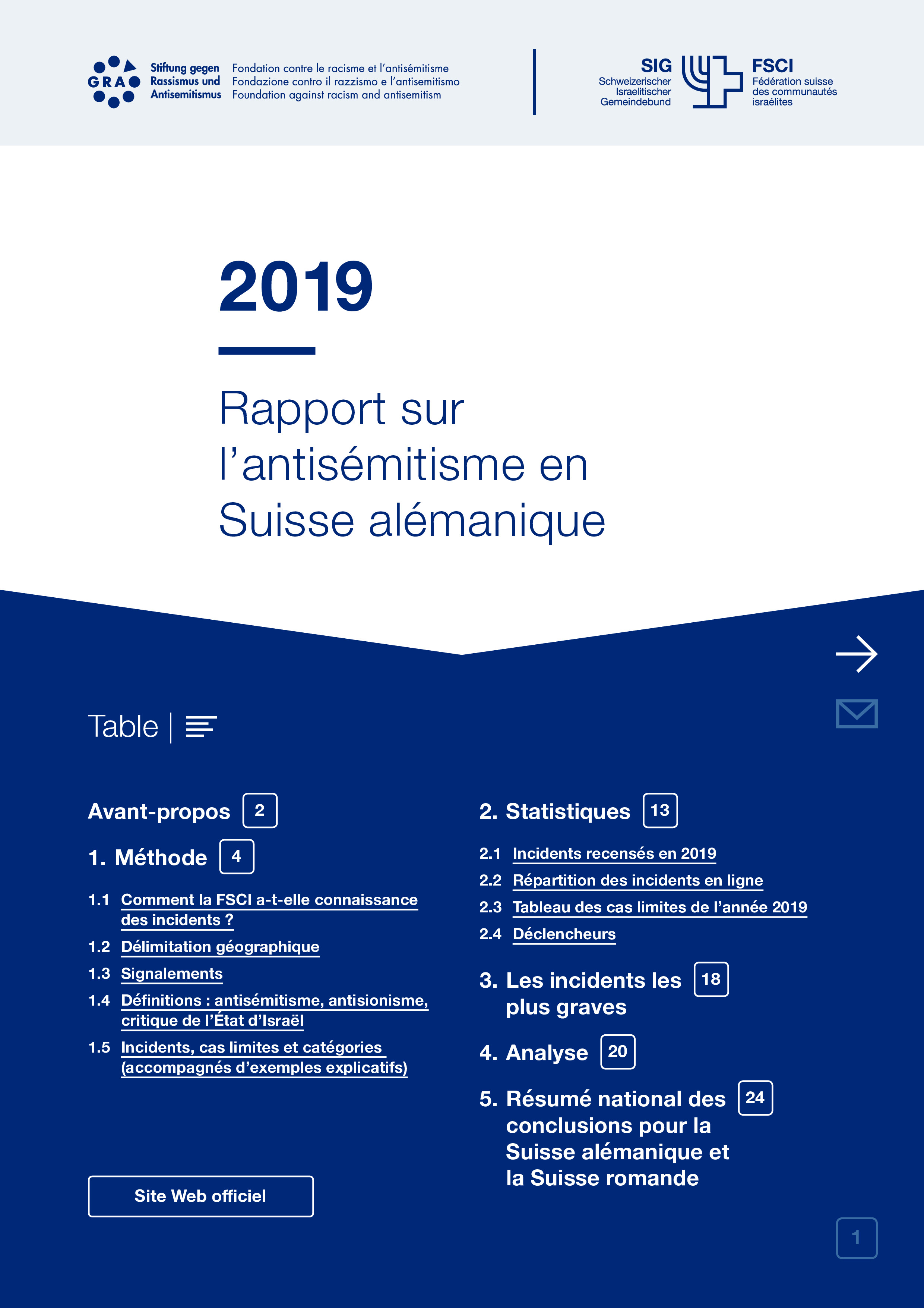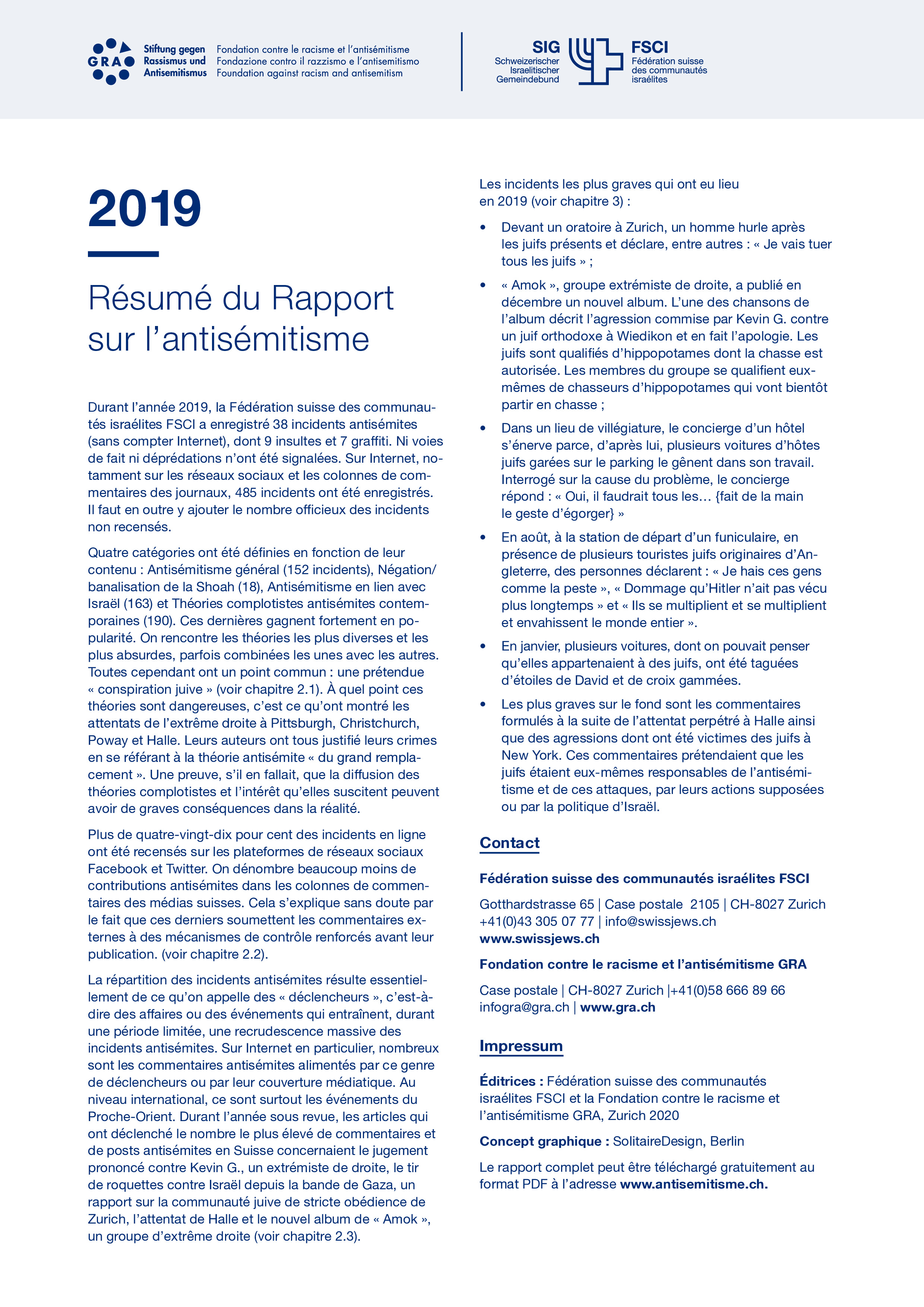 La Fédération suisse des communautés israélites FSCI et la Fondation contre le racisme et l’antisémitisme GRA publient aujourd’hui leur Rapport sur l’antisémitisme 2019 en Suisse alémanique. Comme les années précédentes, le nombre d’incidents antisémites physiques et verbaux est resté relativement stable. Le niveau élevé qu’atteignent les théories du complot antisémites relevées en ligne, est particulièrement préoccupant, y compris en Suisse romande. Pour la première fois cette année, les résultats des différents rapports provenant de la Suisse alémanique et de la Suisse romande ont été réunis en une synthèse commune réalisée conjointement avec la Coordination Intercommunautaire Contre l'Antisémitisme et la Diffamation CICAD.