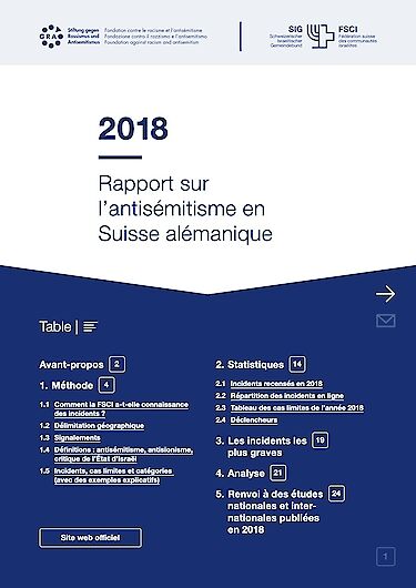 La Fédération suisse des communautés israélites FSCI et la Fondation contre le racisme et l’antisémitisme GRA publient aujourd’hui leur Rapport sur l’antisémitisme 2018 pour la Suisse alémanique. Il ressort de celui-ci que, hors Internet, le nombre des incidents antisémites physiques et verbaux est stable. Les propos et les menaces antisémites circulant sur Internet et les réseaux sociaux continuent à inquiéter.