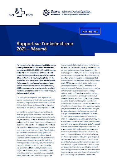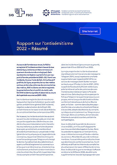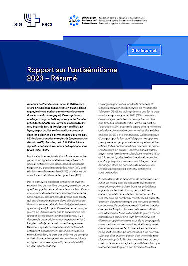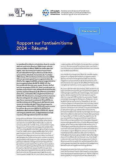 Rapport entierLe nombre d’incidents antisémites physiques et verbaux est resté relativement stable. Le niveau élevé qu’atteignent les théories du complot antisémite relevées en ligne est particulièrement préoccupant, y compris en Suisse romande. Pour la première fois cette année, les résultats des différents rapports provenant de la Suisse alémanique et de la Suisse romande ont été réunis en une synthèse commune réalisée conjointement avec la Coordination Intercommunautaire Contre l'Antisémitisme et la Diffamation CICAD.