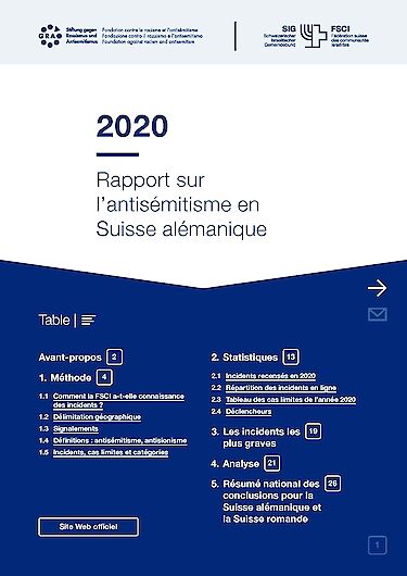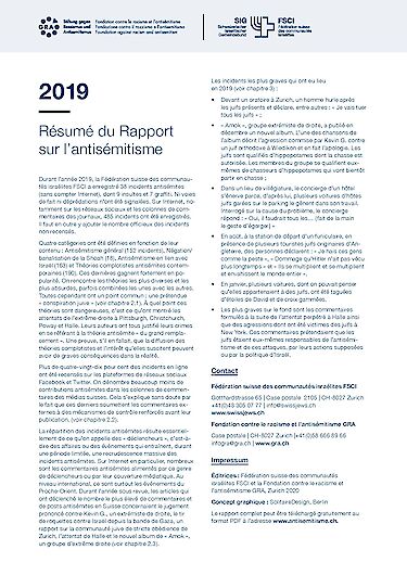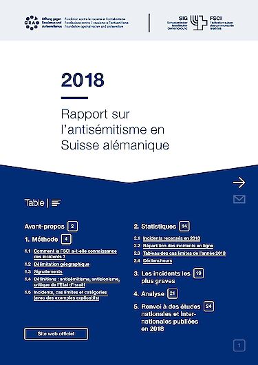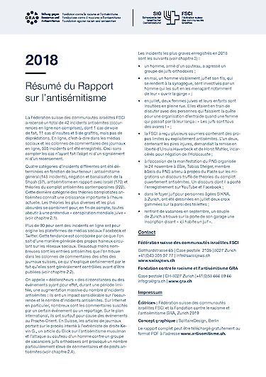 Depuis 2008, la FSCI publie avec la Fondation contre le racisme et l’antisémitisme GRA un Rapport sur l’antisémitisme annuel destiné à la Suisse alémanique, mais entre-temps étendu aux incidents survenus dans la Suisse de langue italienne et rhéto-romane. Dans le but de préciser les méthodes et les définitions utilisées et de mettre à disposition davantage d’informations contextuelles, ce rapport a été entièrement refondu à partir de l’édition 2018.