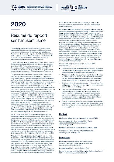 Rapport entierLes relevés montrent que le nombre d’incidents antisémites physiques et verbaux se maintient à un faible niveau. En ligne est à signaler un regain des théories du complot antisémite, qui, fait nouveau, sont étroitement liées à la pandémie du coronavirus, laquelle s’est avérée d’une manière générale être un véritable déclencheur d’antisémitisme. Dans l’entourage des rebelles du corona et des adeptes des chats de groupe sur Telegram se sont fait remarquer des personnes véhiculant des opinons et des messages antisémites. Nous considérons aussi comme très problématique l'instrumentalisation croissante de la Shoah par les rebelles du corona.