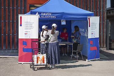 In Davos sind diesen Sommer jede Woche zehn Vermittlerinnen und Vermittler im Einsatz. Likratina Tamar fährt an diesem Tag zuerst auf das Rinerhorn. Schon vor dem Mittag sind hier verschiedene jüdische Familien anzutreffen, die das Panorama geniessen und der Hitze im Tal entfliehen. Ein älteres Ehepaar aus Zürich sitzt auf der Terrasse und freut sich über den kurzen Schwatz mit Tamar. Sie haben schon von Likrat Public gehört und bedanken sich für die wichtige Arbeit, die das Likrat-Team in Davos leistet.