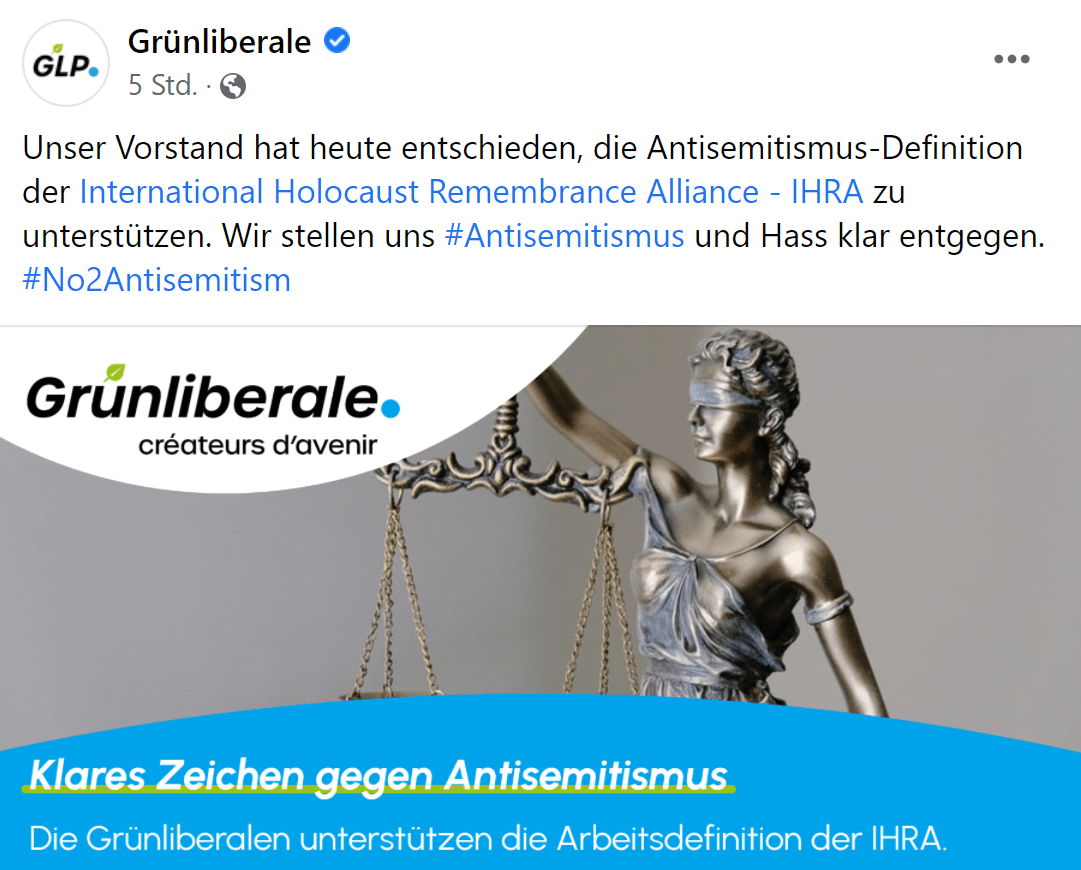 Auch die Grünliberalen Schweiz haben nun die Unterstützung der IHRA-Definition beschlossen. Sie schliesst sich damit anderen Parteien an. Der SIG ruft alle weiteren zur Anerkennung und Unterstützung auf.