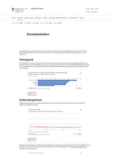 Das Bundesamt für Statistik BFS bietet seit 2016 ein Monitoring zu Rassismus und Fremdenfeindlichkeit an und informiert über das Zusammenleben der verschiedenen Bevölkerungsgruppen in der Schweiz.
